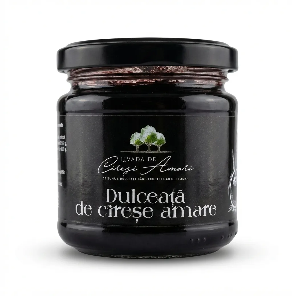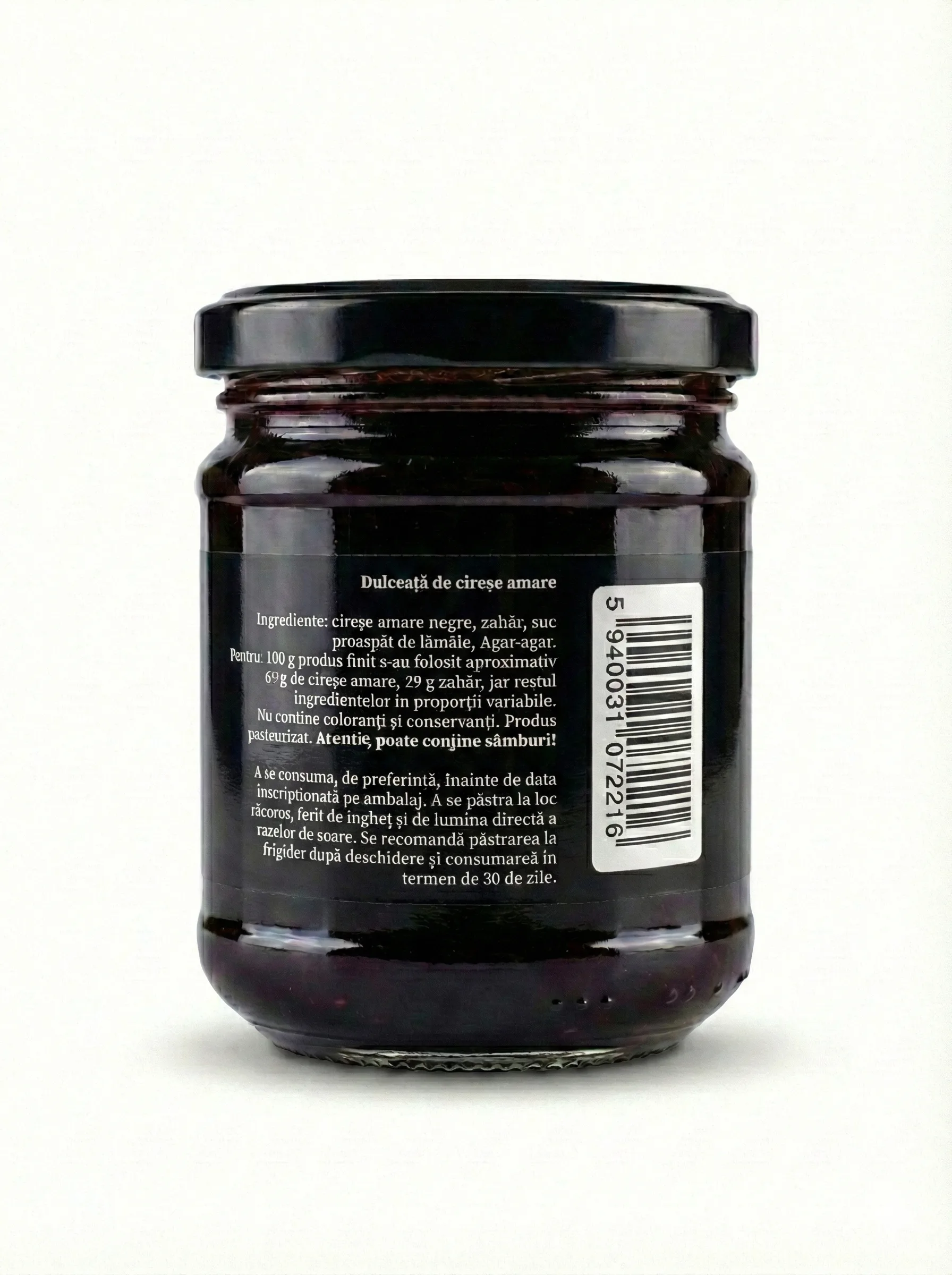 Pentru a obține 100 g de produs am folosit 69 de grame de cireșe amare, 29 g de zahăr și celelalte ingrediente în cantități variabile. Cireșele provin din propria livadă și sunt din soiul Silva (Amar de Dâmbovița).